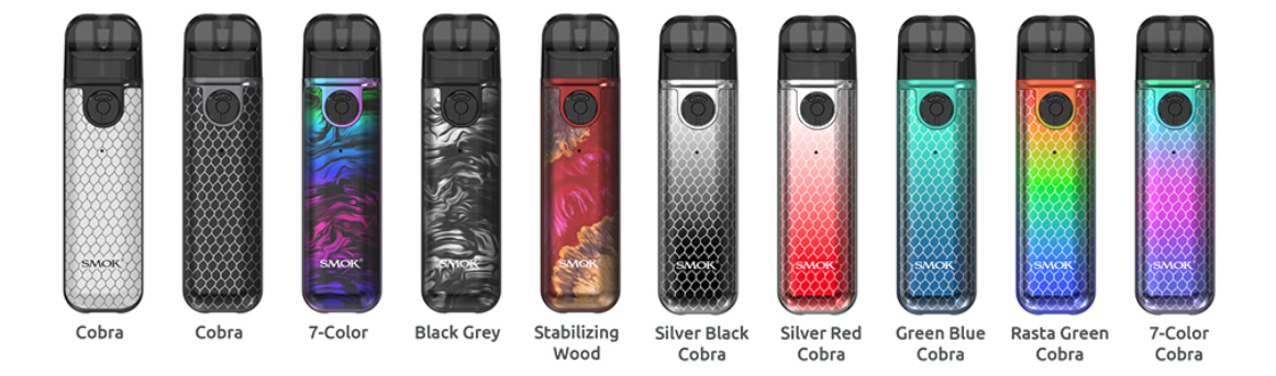 Дизайн продолжает концепции предыдущих версий или аналогичных девайсов от Smok. 10 цветовых решений двух серий regular (классические цвета) и prismatic (градиенты). Кнопок на корпусте нет, следовтельно, активация затяжки происходит по датчику. Есть индикатор заряда, а также кольцо регулировки обдува, как и в старшей версии. В отличие от старшего брата Novo 4 mini слегка меньше в размерах, и у него отсутствует дисплей, что, конечно же, уменьшает его стоимость, но экран нужен далеко не всем, поэтому этот под с легкостью найдет своих пользователей.