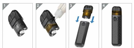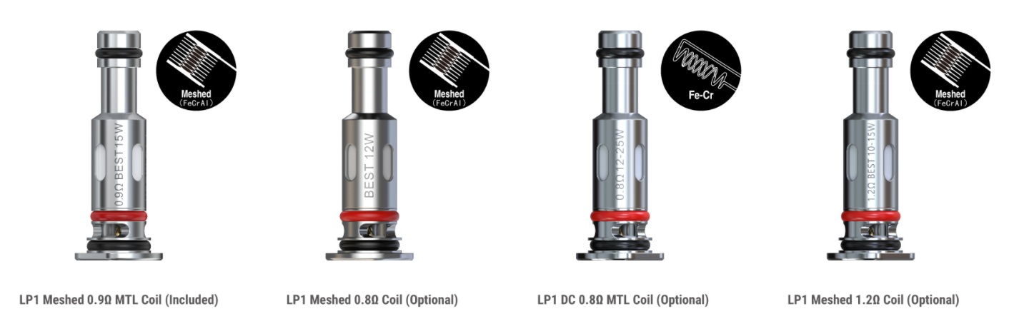 Картридж,и как и у предыдущей модели, не имеют встроенных испарителей. Заправка боковая, стенки прозрачные, объем 2мл. Испарители вставляются снизу. Испарители используются все той же серии LP1, в комплекте можно найти пару таких с сопротивлением 0.9 Ом с нагревательным элементом в виде сетки.