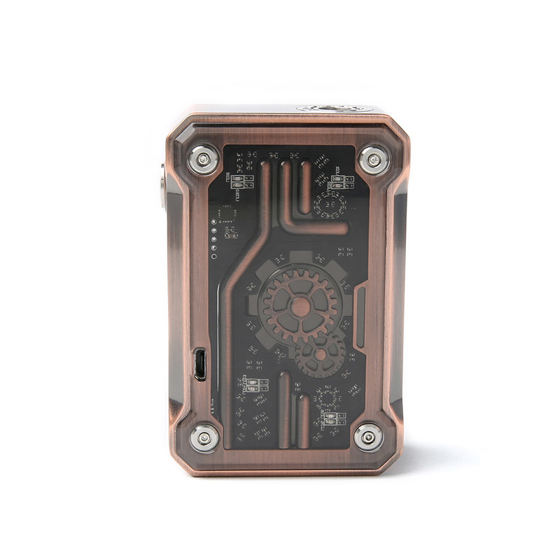 Если вы фанат стиля Стимпанк, то Tesla Punk 220W это находка для вас! Корпус мода изготовлен из цинкового сплава. Через боковые прозрачные панели красуются шестеренки и стильная подсветка. Небольшой дисплей для вывода информации и всего четыре кнопки - Fire и три дополнительные для смены режимов и регулировки параметров. Площадка под атомайзер достаточно большая, позволяет вместить атомайзеры до 25 мм в диаметре.